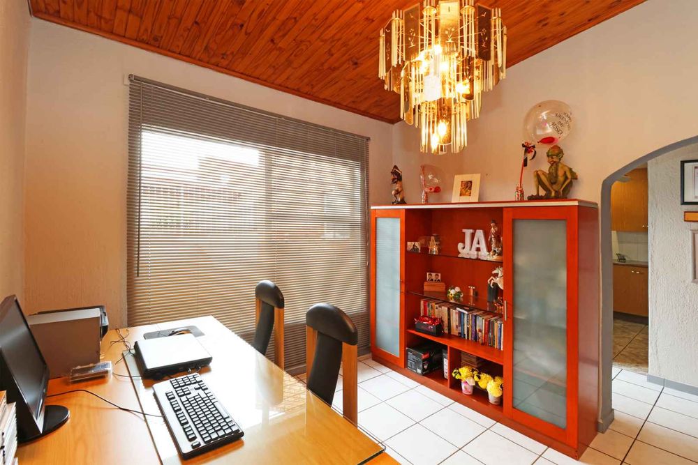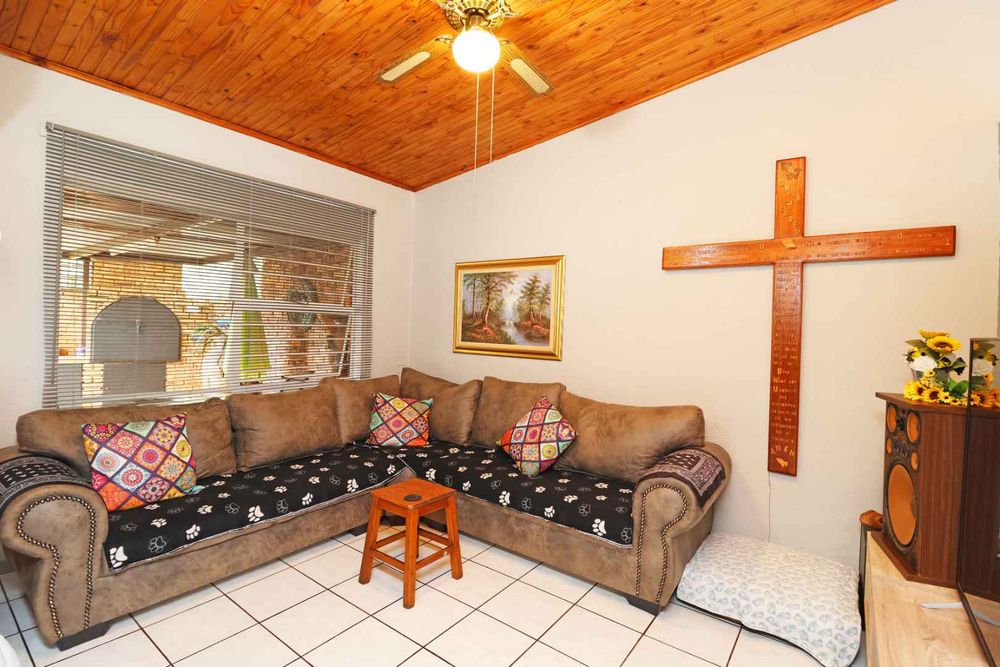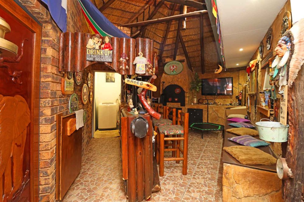 From the kitchen, a back door leads directly to a thatched roof lapa “man cave” complete with: