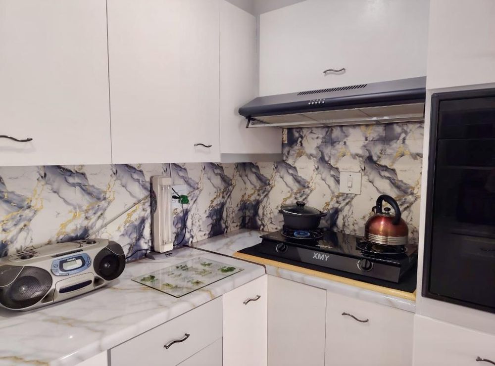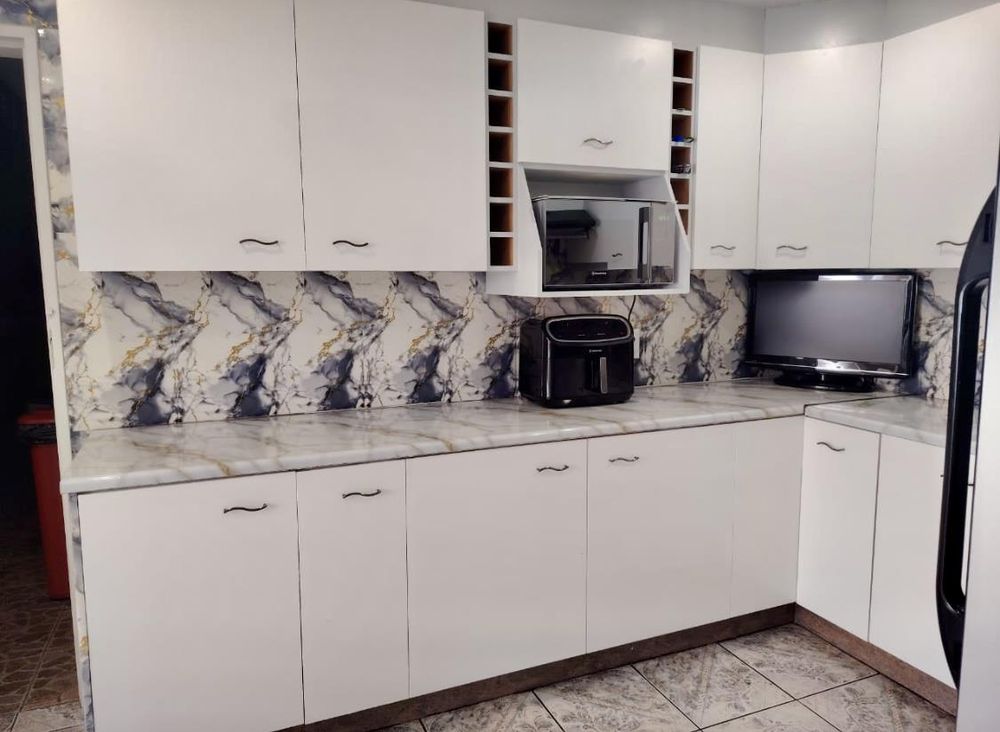 The modern upgraded kitchen features new cabinetry with a sleek aesthetic, extensive countertop space, a pantry, and a reconfigured layout to accommodate modern appliances such as a double-door fridge. A separate hidden scullery keeps the kitchen clutter-free.