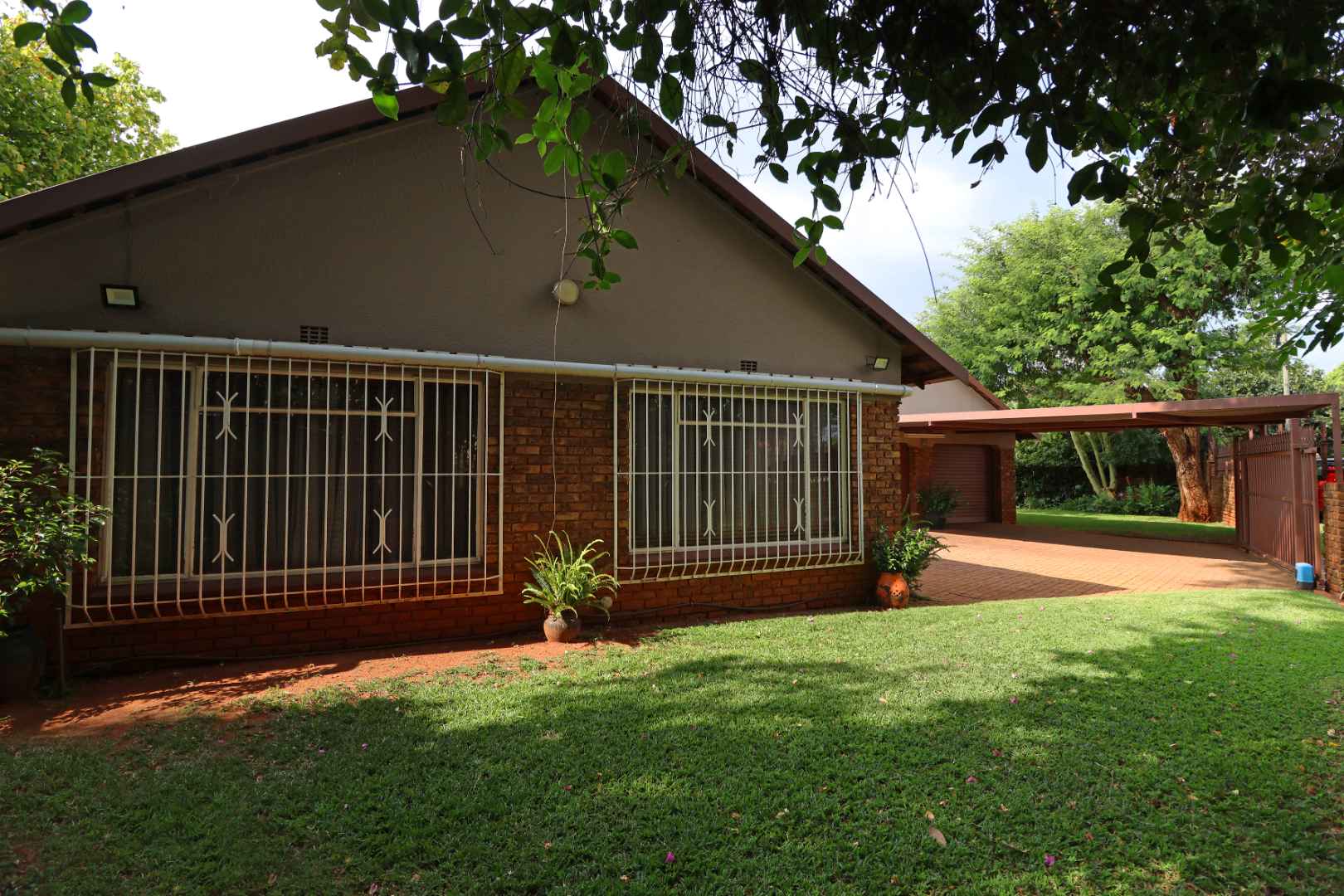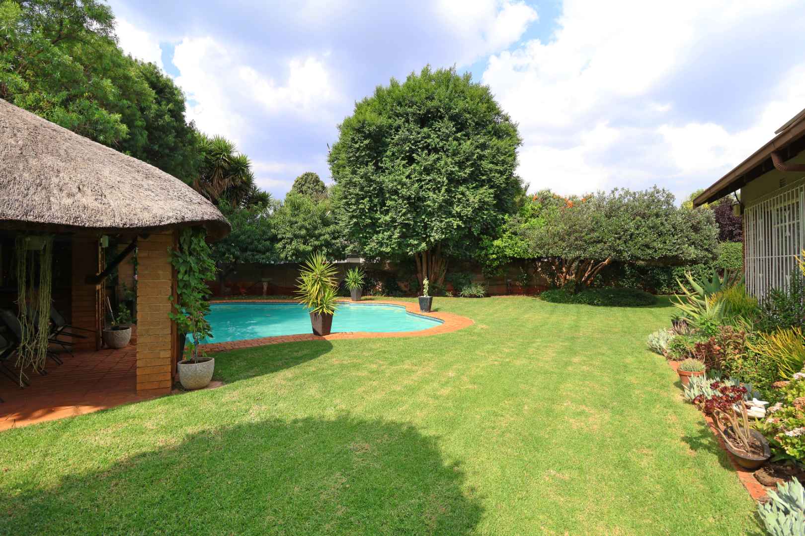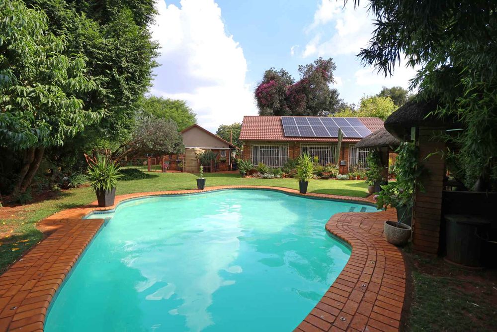 Outside is where this home truly shines. Enjoy endless summer days around the sparkling swimming pool, complemented by a stylish lapa with a built-in bar—an entertainer’s paradise. The landscaped garden is kept lush year-round with an automatic irrigation system fitted with a rain sensor, ensuring smart water usage.
