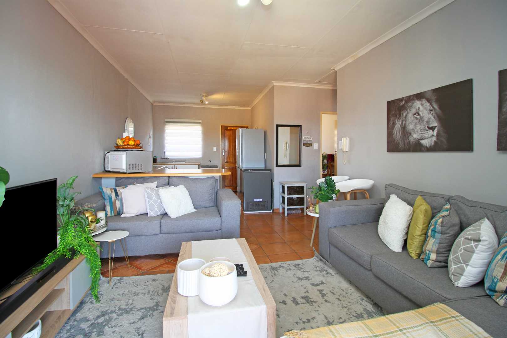 The apartment features a spacious open-plan kitchen and living area with plenty of natural light, leading to a private balcony with a build in braai—ideal for relaxing or entertaining.