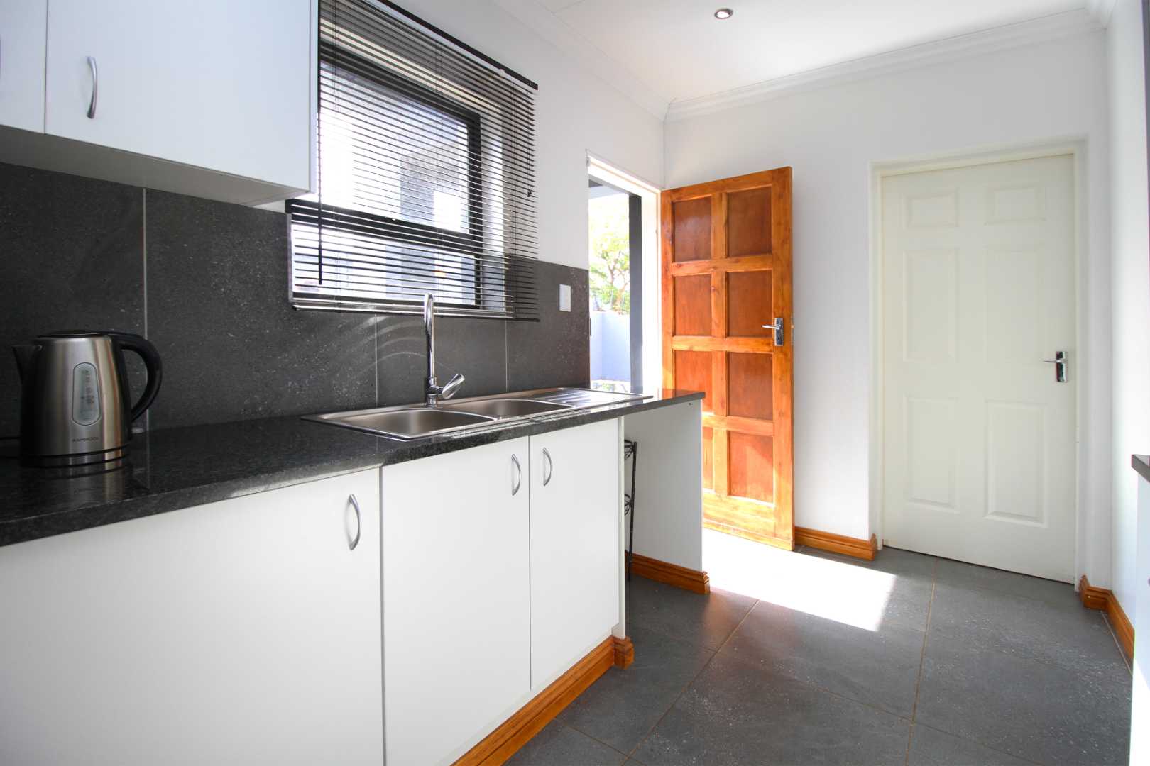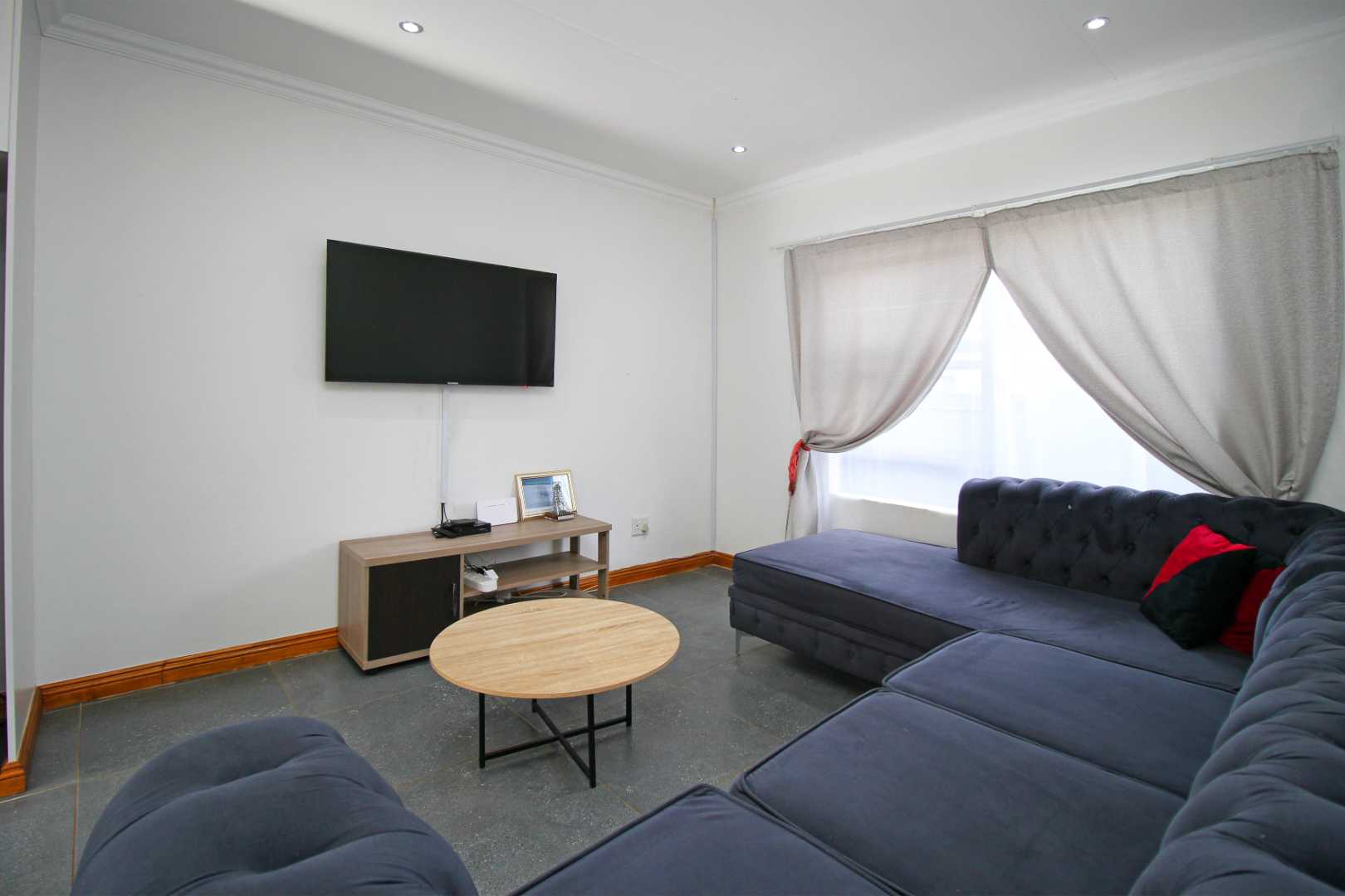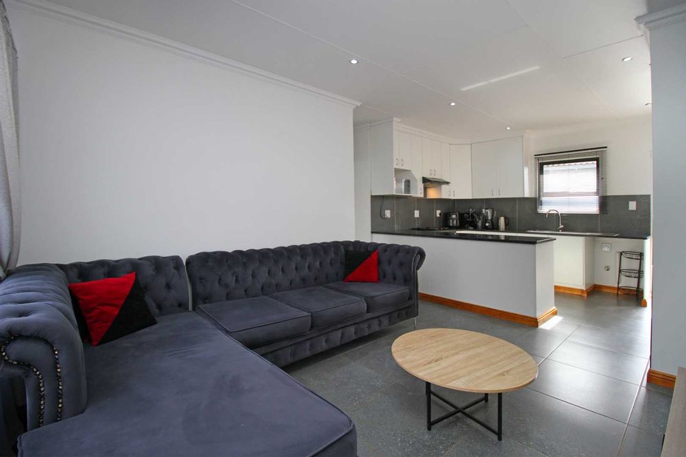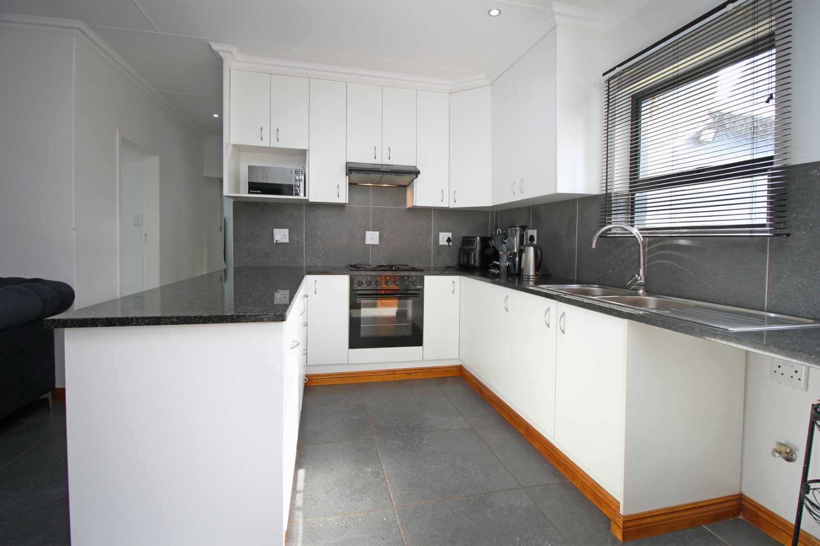 The open-plan TV room is ideal for family gatherings or quiet evenings, providing a cozy yet spacious setting. The neat, well-appointed kitchen boasts modern finishes, with plenty of cabinetry and counter space, making meal preparation a breeze.