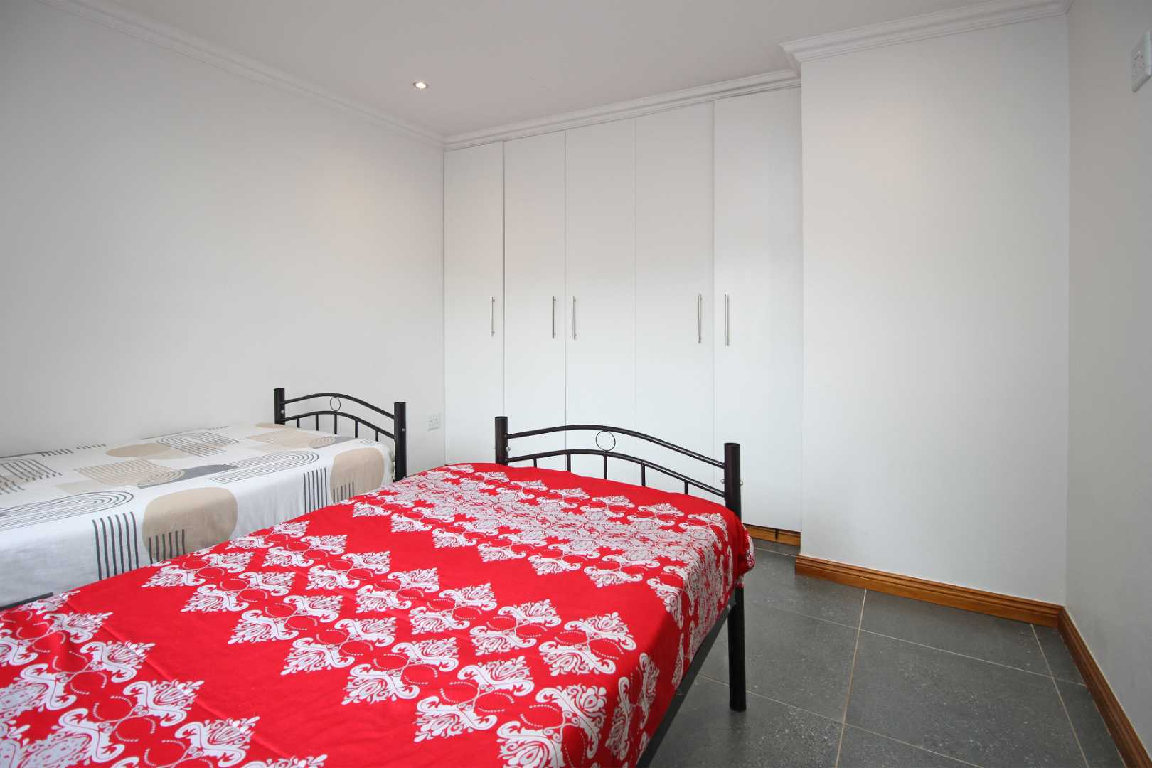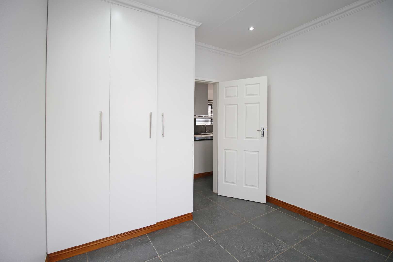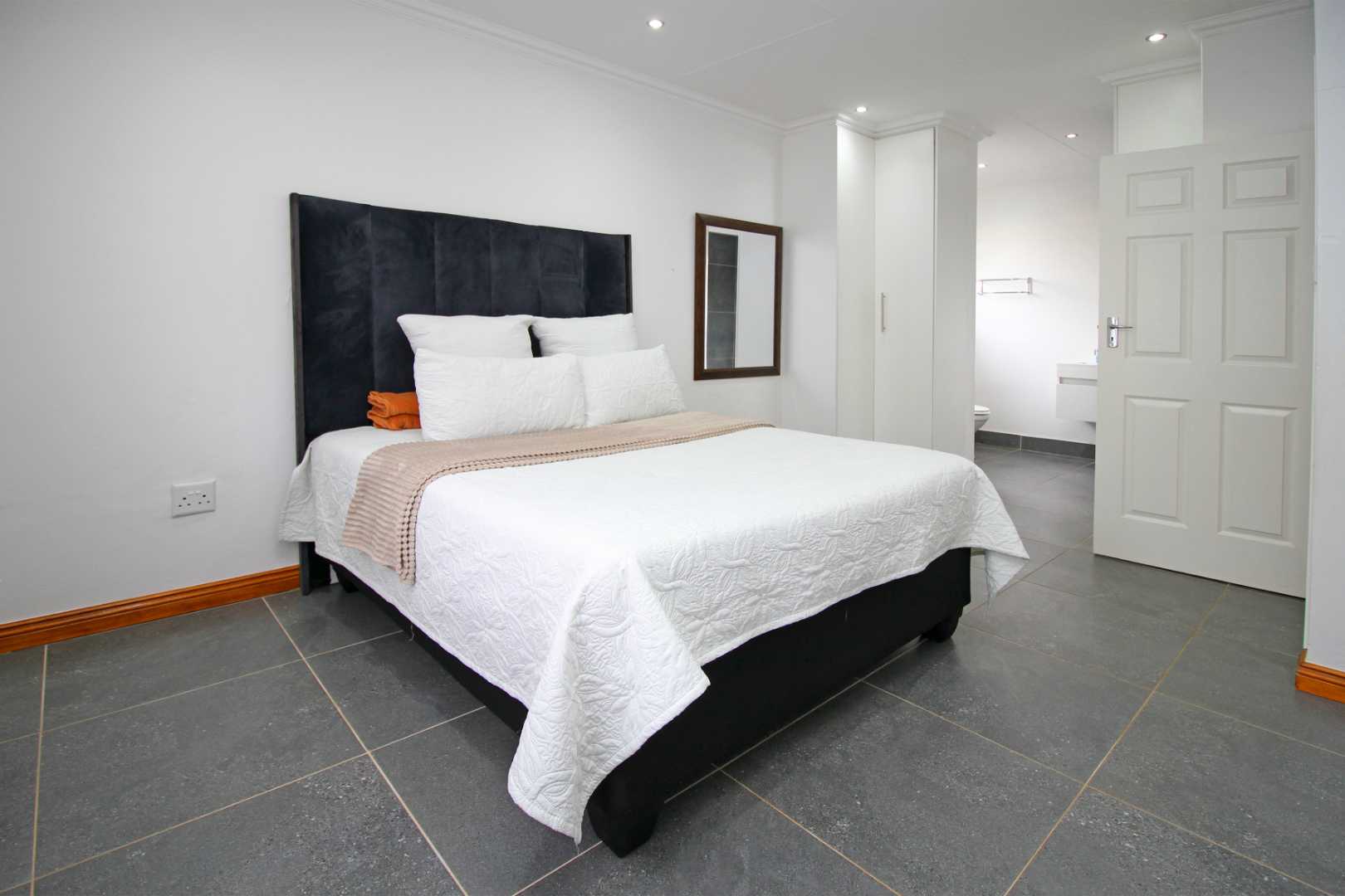 The open-plan TV room is ideal for family gatherings or quiet evenings, providing a cozy yet spacious setting. The neat, well-appointed kitchen boasts modern finishes, with plenty of cabinetry and counter space, making meal preparation a breeze.