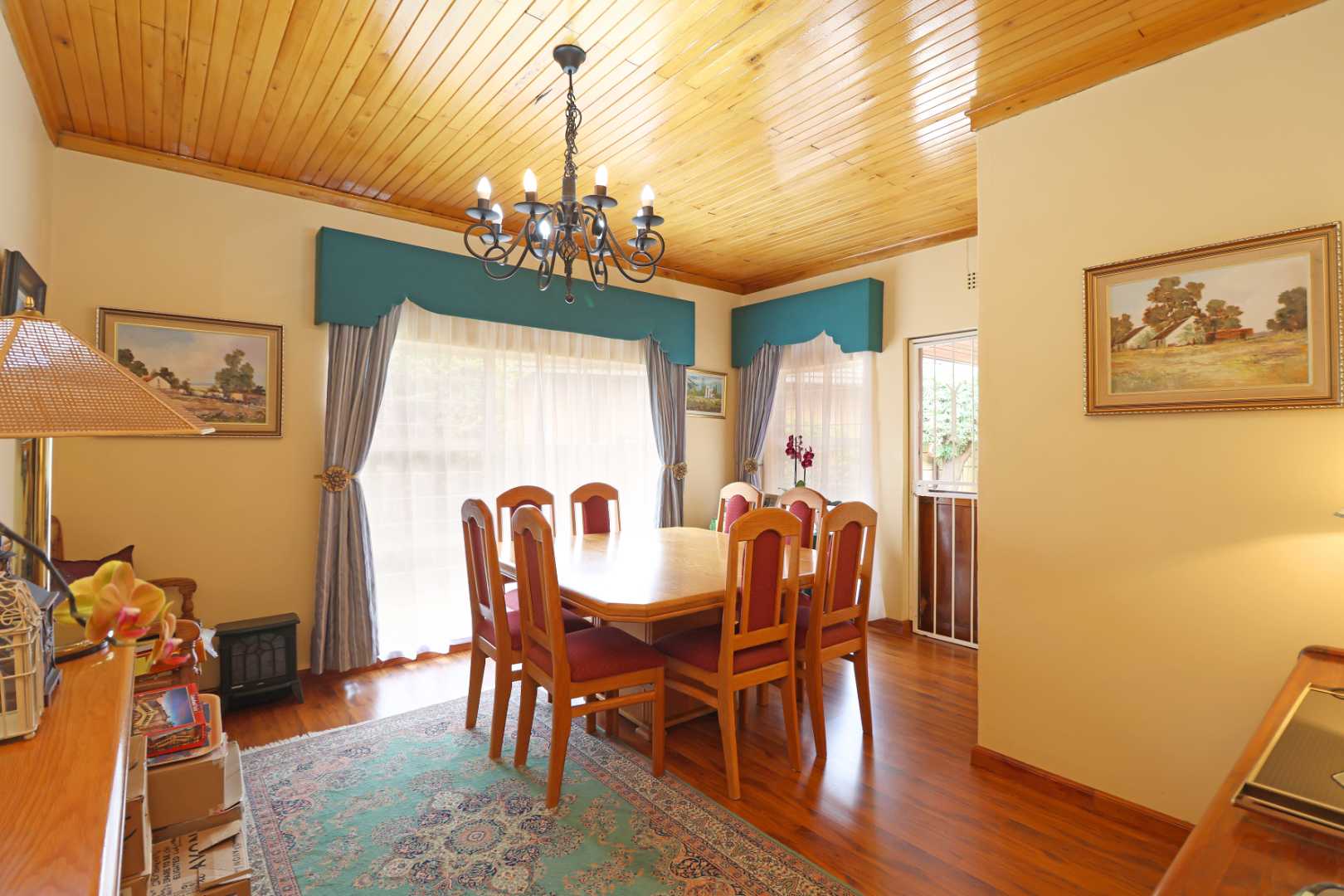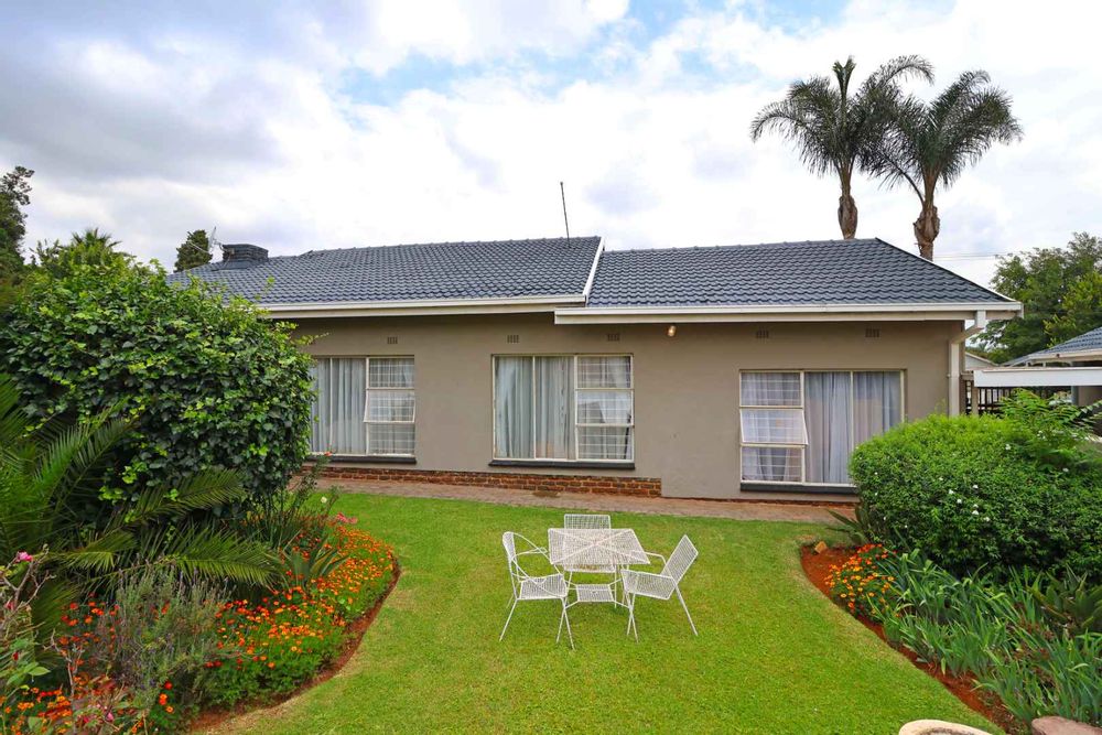 The modern kitchen flows seamlessly into the dining area, which opens onto a charming stoep, perfect for relaxed family meals. A separate study provides an ideal work-from-home space. The TV lounge, finished with laminated floors and beautifully maintained wooden ceilings, creates a warm and inviting atmosphere.
