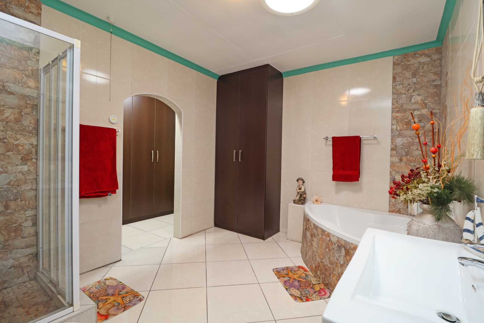 Full en-suite bathroom with corner bath, shower, basin, ablutions and built-in storage