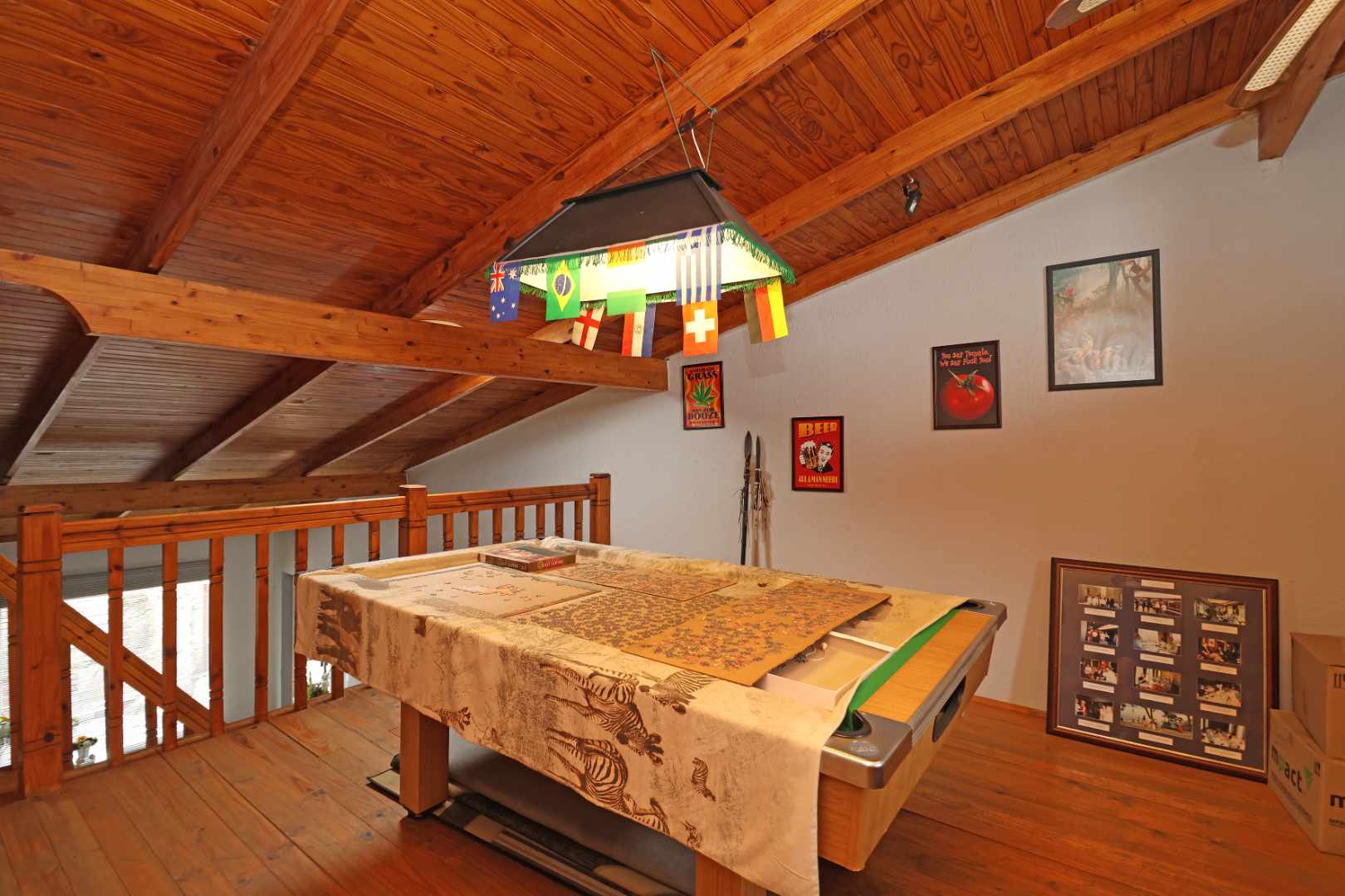 A striking feature is the loft entertainment area, accessed via a solid wooden staircase from the kitchen. The loft includes a built-in bar, pool table, seating and ample space for movement, and overlooks the TV/living room with a stylish balcony railing — ideal for relaxed entertaining or social gatherings.