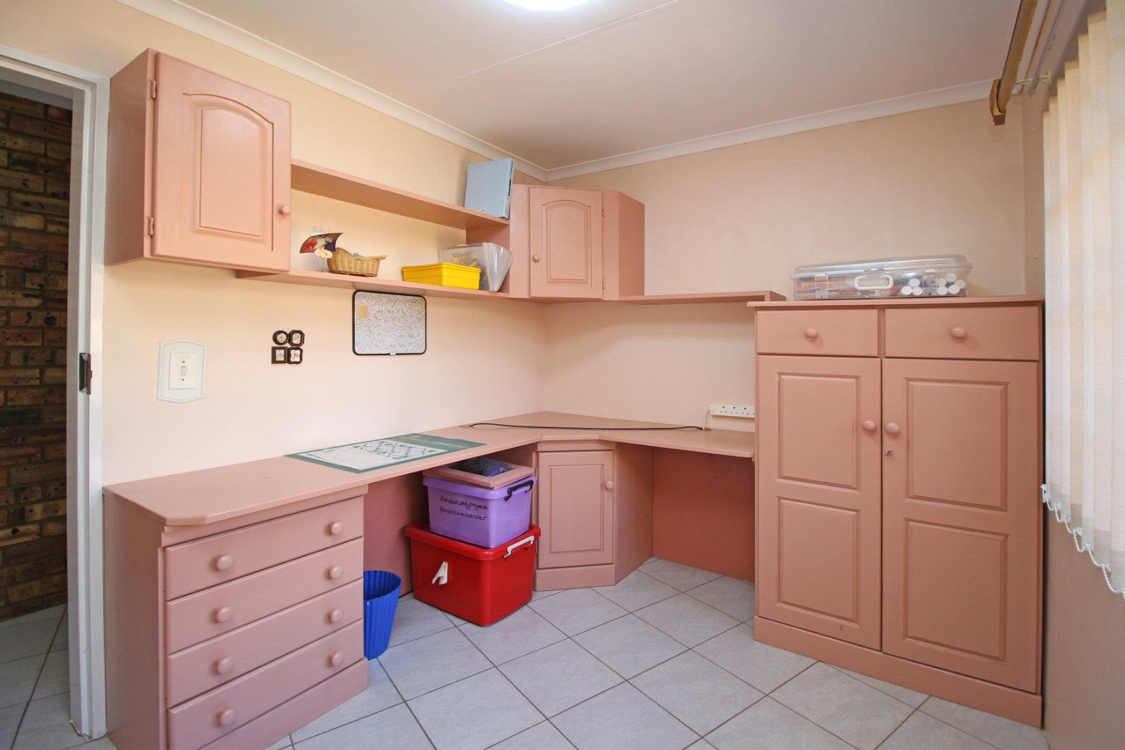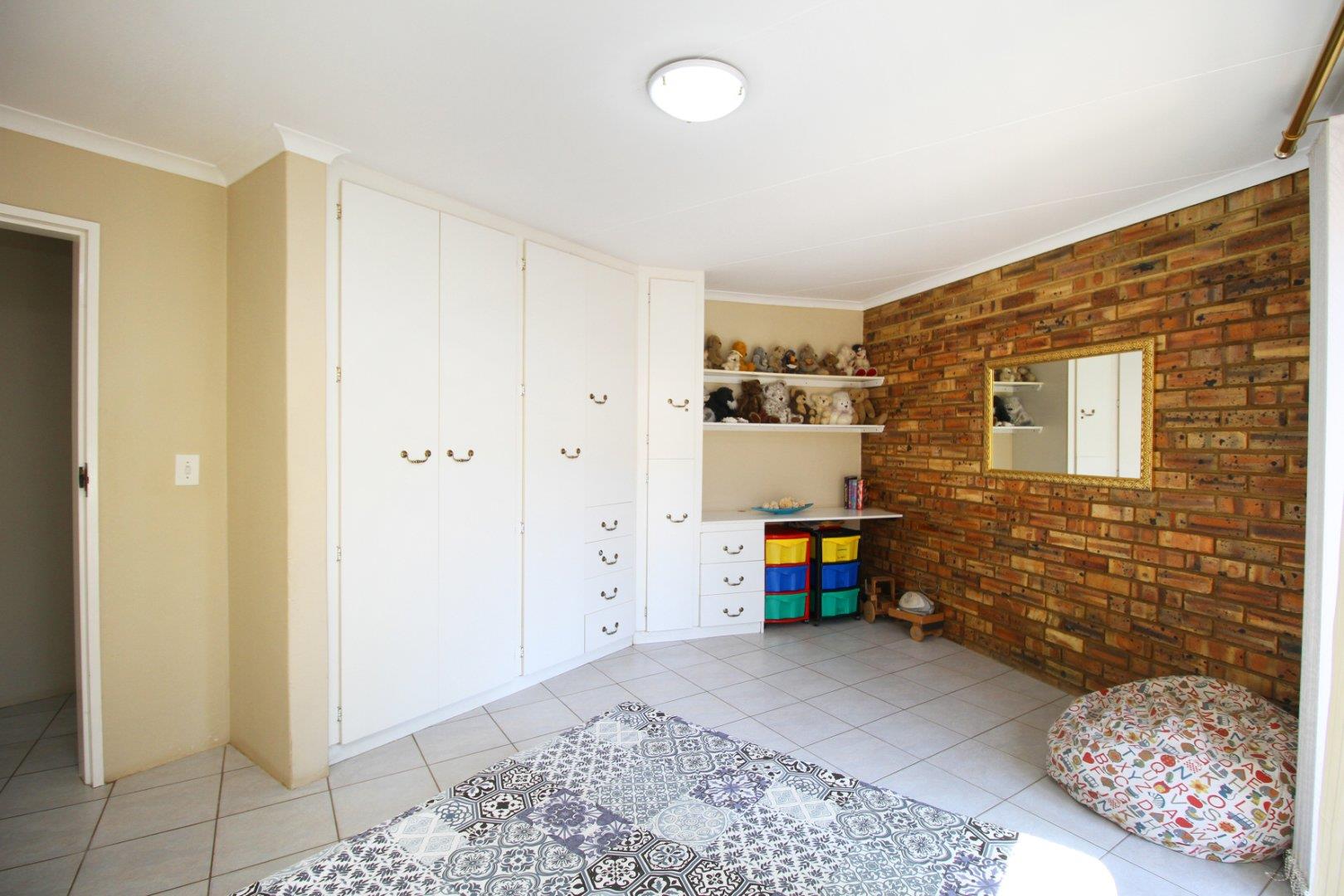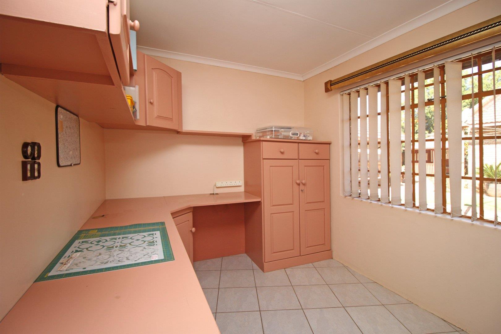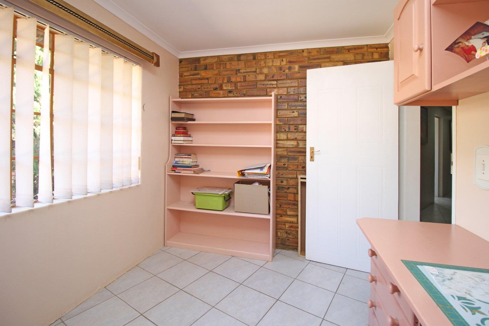 Down the passage, you’ll find a convenient laundry room, a dedicated hobby room, a private study, and three spacious bedrooms, each with sliding doors opening into a sunny courtyard. The home boasts two full bathrooms, with the main bedroom enjoying a en-suite.